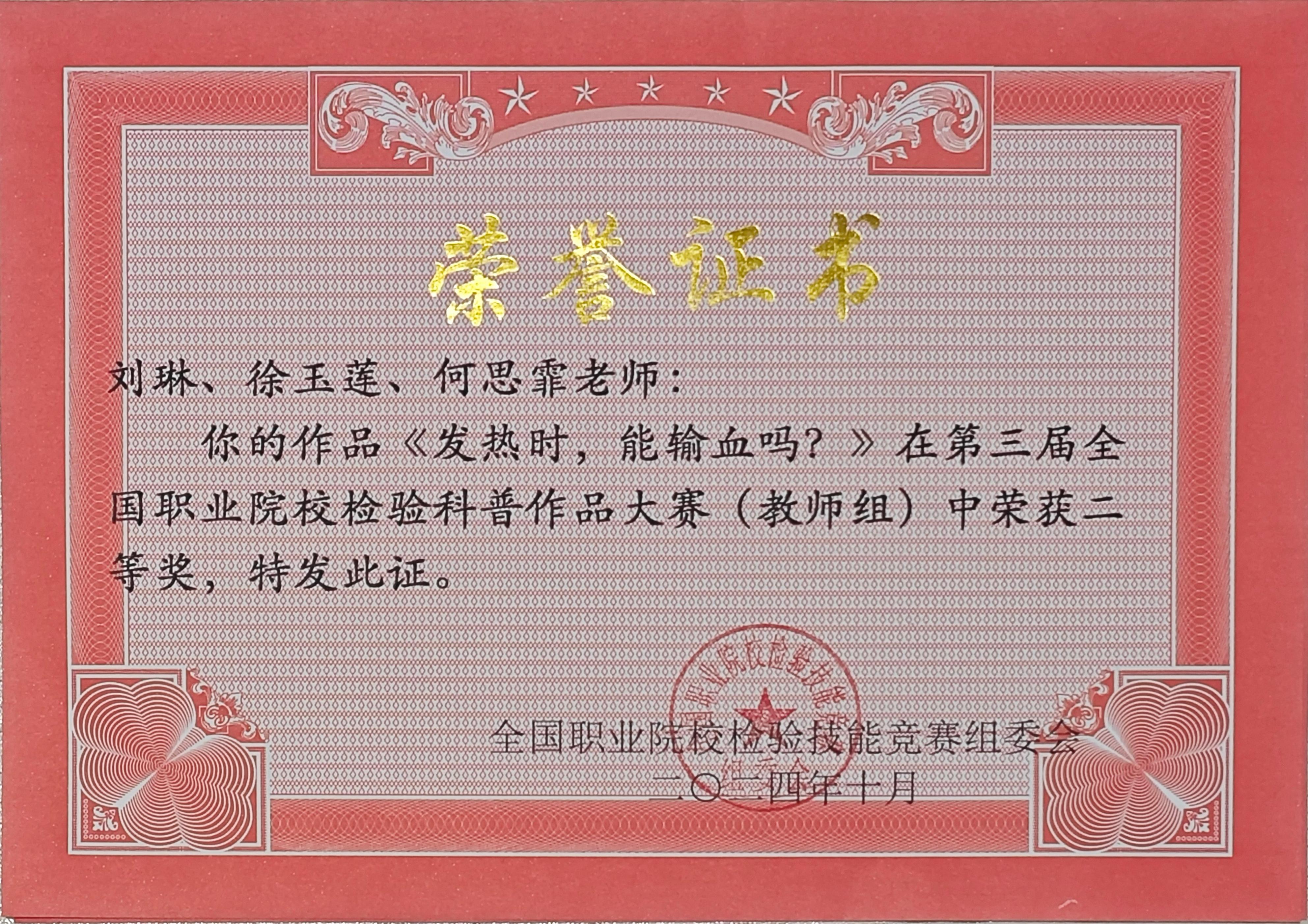 本次大赛吸引了来自全国多所职业院校的师生参与,参赛作品涵盖了检验医学的各个方面。经过激烈的角逐,我院刘琳、徐玉莲、何思霏老师制作的《发热时,能输血吗?》科普视频荣获二等奖。该科普视频以生动的案例和浅显易懂的语言,向公众普及了发热时是否可以输血的重要知识点。