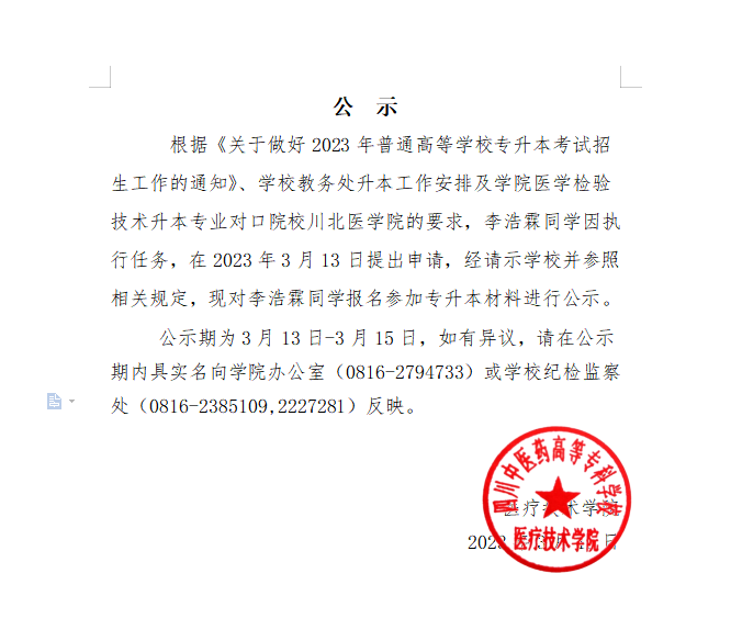医疗技术学院关于2023届医学检验技术李浩霖报名参加升本考试审核名单的公示