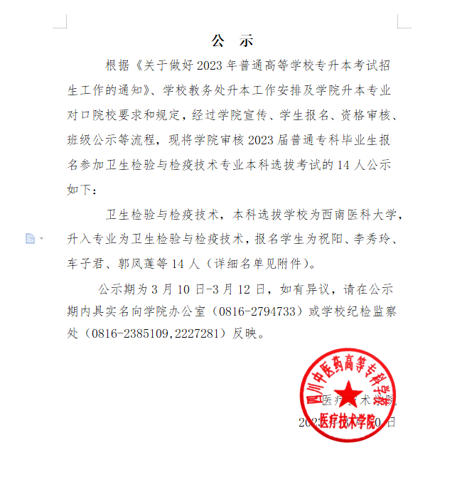 医疗技术学院关于2023届普通专科卫生检验与检疫技术毕业生报名参加升本考试审核名单的公示