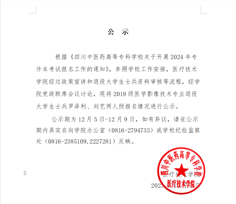 医疗技术学院关于罗泽利、刘艺报名参加2024年升本考试的公示