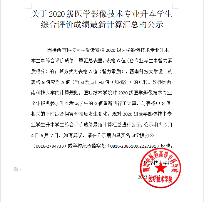 关于2020级医学影像技术专业升本学生综合评价成绩最新计算汇总的公示