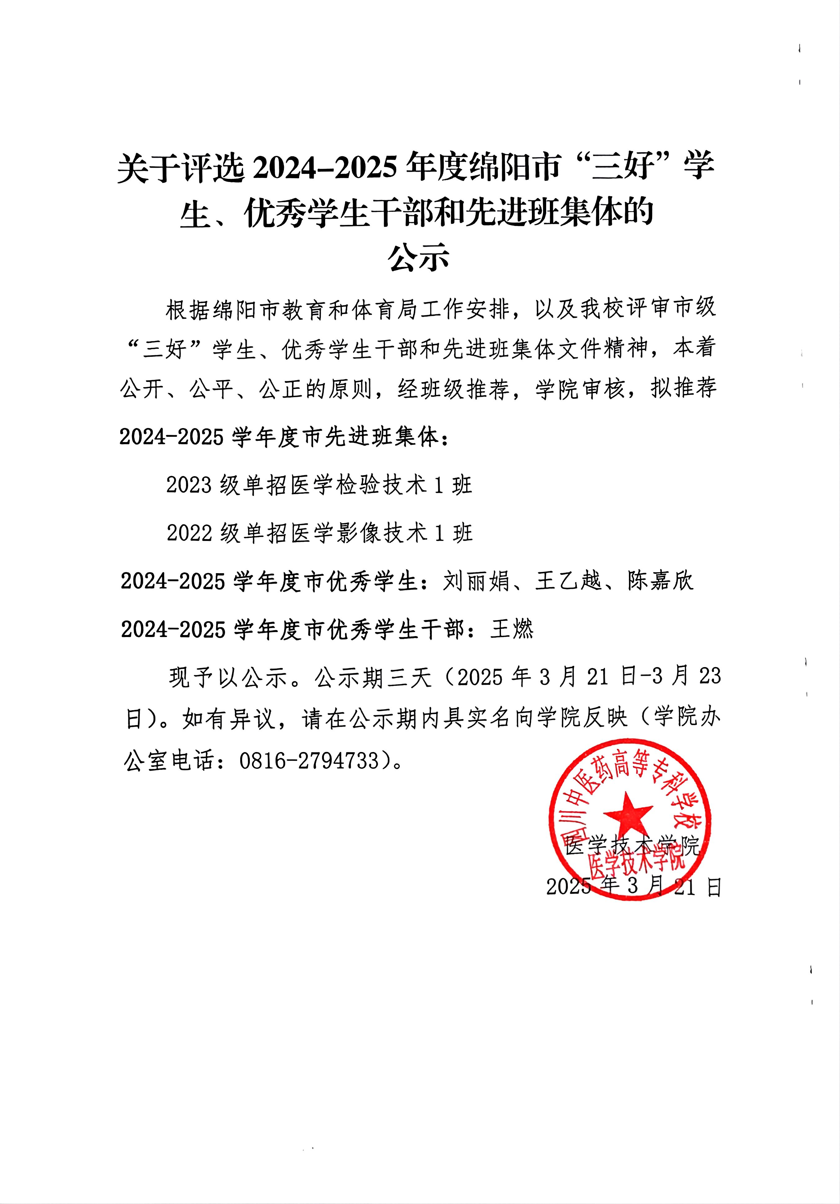 关于评选2024-2025年度绵阳市“三好”学生、优秀学生干部和先进班集体的公示