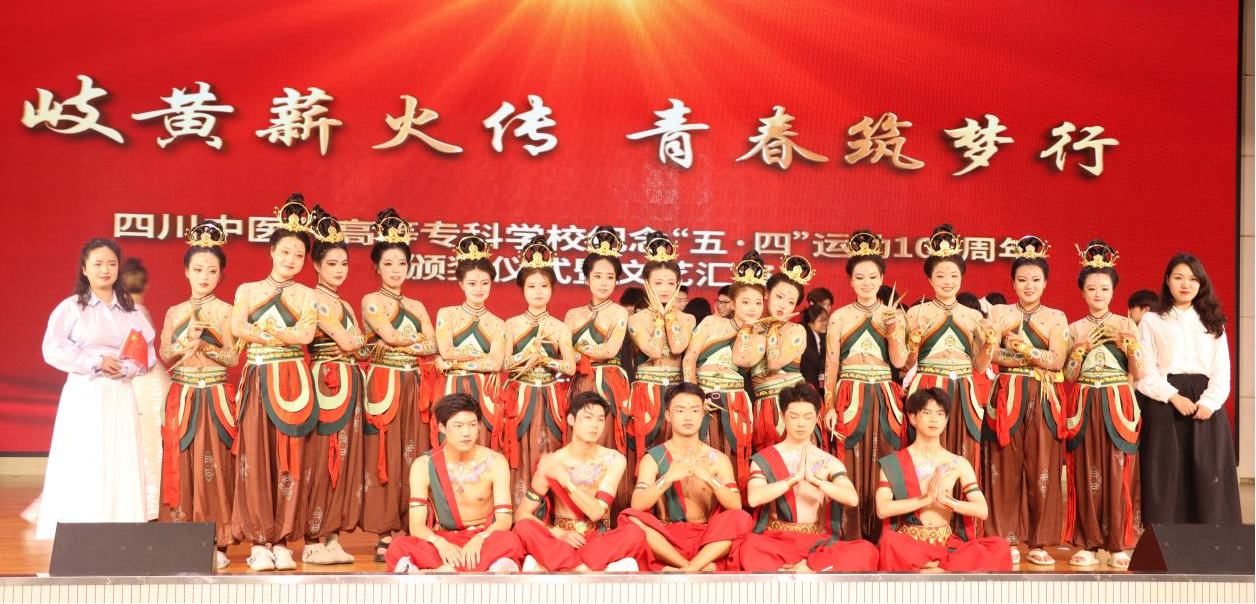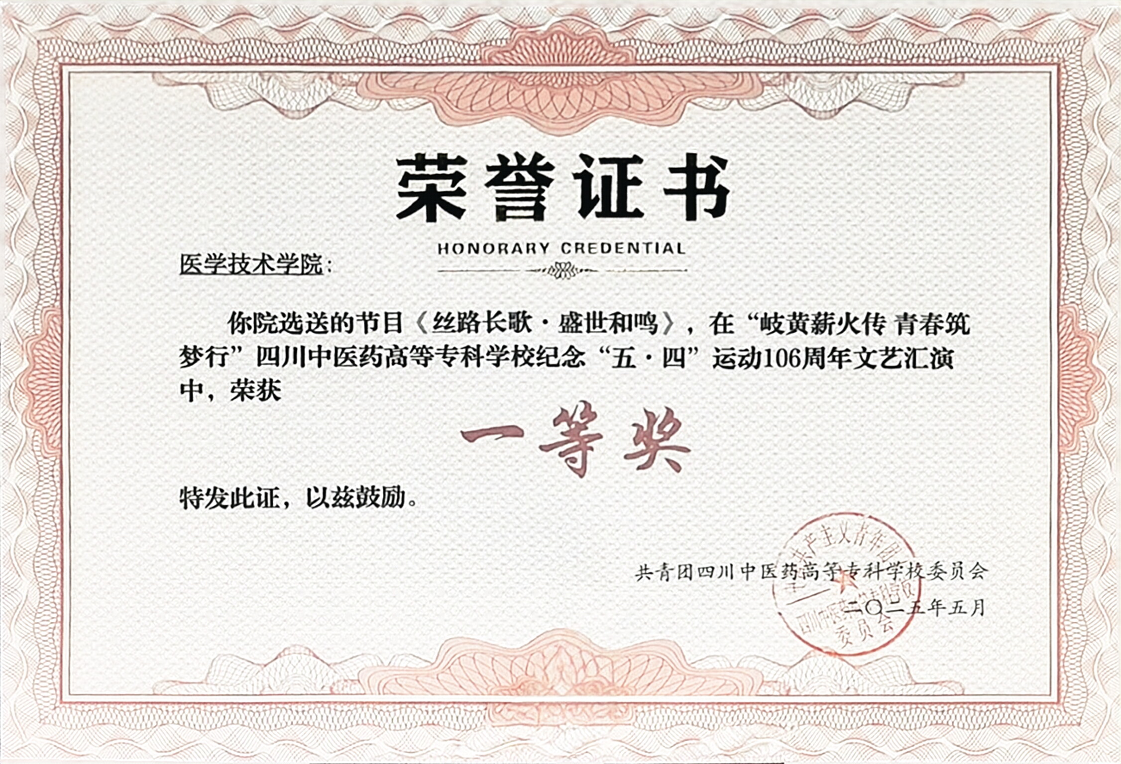 为弘扬“五四”精神,传承岐黄薪火,四川中医药高等专科学校于4月28日隆重举办“岐黄薪火传青春筑梦行”纪念“五·四”运动106周年颁奖仪式暨文艺汇演。医学技术学院选送的舞蹈节目《丝路长歌·盛世和鸣》凭借精湛的表演与深厚的文化底蕴,从众多优秀作品中脱颖而出,荣获一等奖。