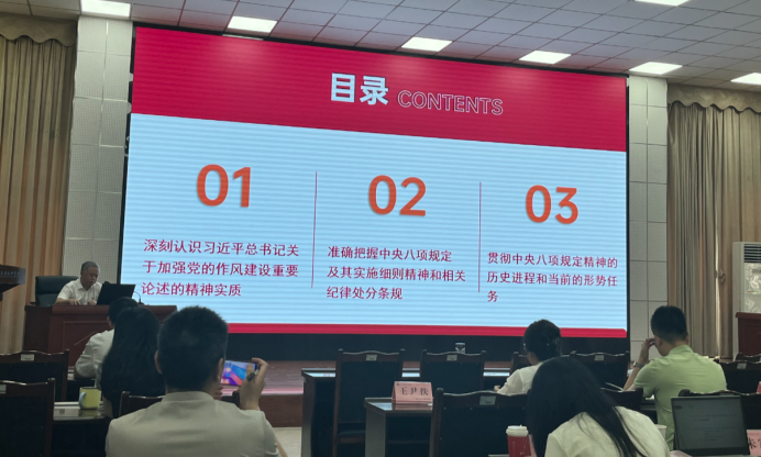 接着,李文虎书记从认识习近平总书记关于加强党的作风建设重要论述的精神实质、准确把握中央八项规定及其实施细则精神和相关纪律处分条规、贯彻中央八项规定精神的历史进程和当前的形势任务等三个方面进行讲解;强调落实中央八项规定精神是一场持久战,需在常、长、严、实、深、细上下功夫,并引导党员干部深刻理解作风建设的内涵与要求。