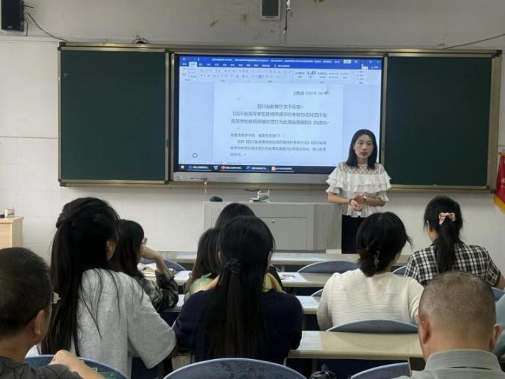 在师德师风专题学习中,重点学习了《四川省高等学校教师师德评价考核办法》及实施细则。会议要求,全体教师要坚守育人初心,将医德教育与师德建设深度融合,在教育教学全过程践行师德规范,争做新时代"四有"好老师。