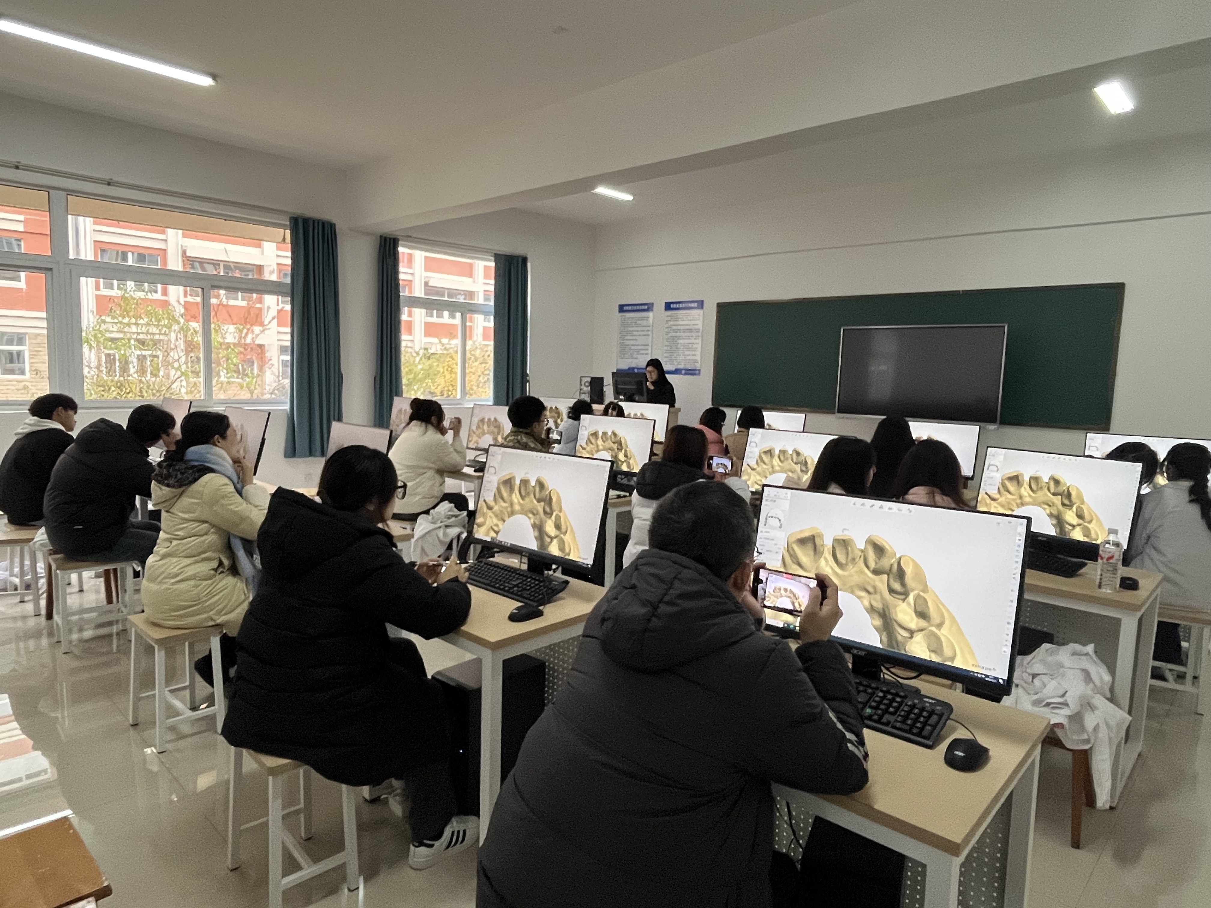 本次培训在远志楼数字化实训室举行,由我院优秀毕业生、企业技术骨干孙婧老师主讲。她以“3Shape软件应用与口腔修复体数字化设计”为主题,系统讲解理论并指导实操。学生积极参与,收获显著,通过理实一体教学进一步掌握了数字化设计技能,为参赛奠定了扎实基础。