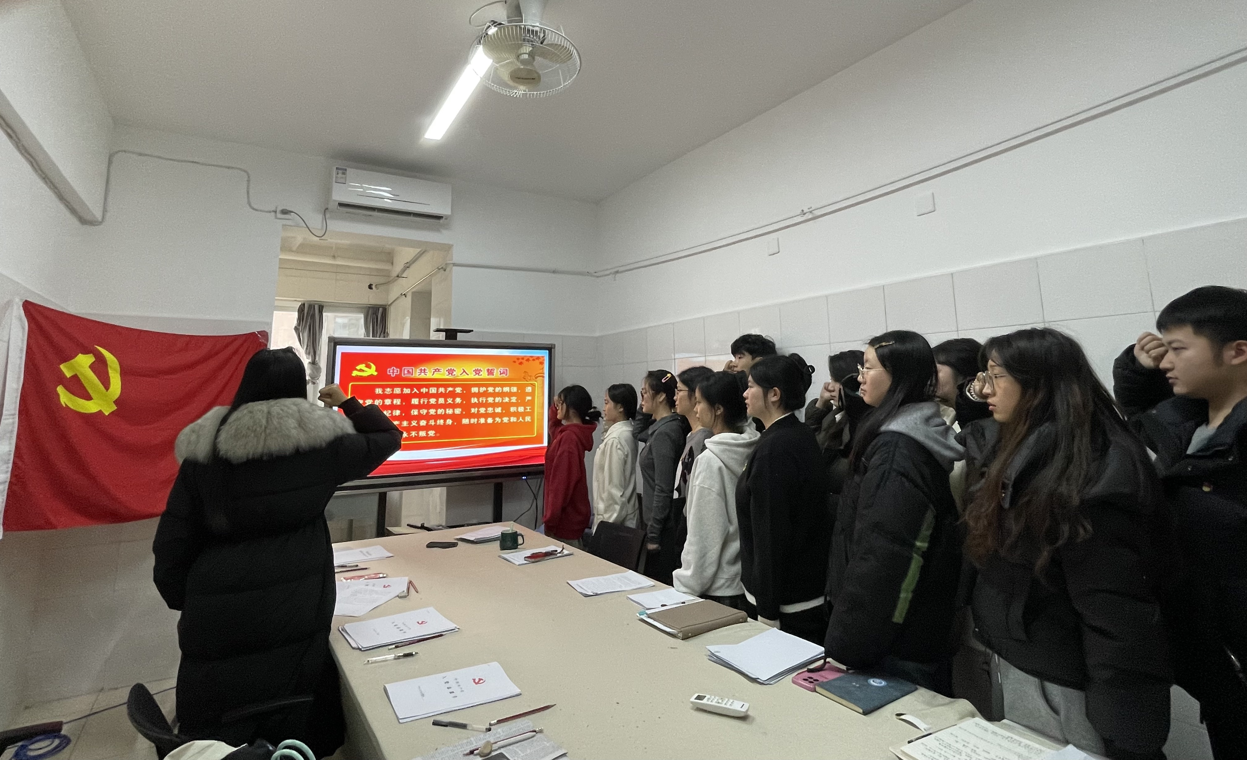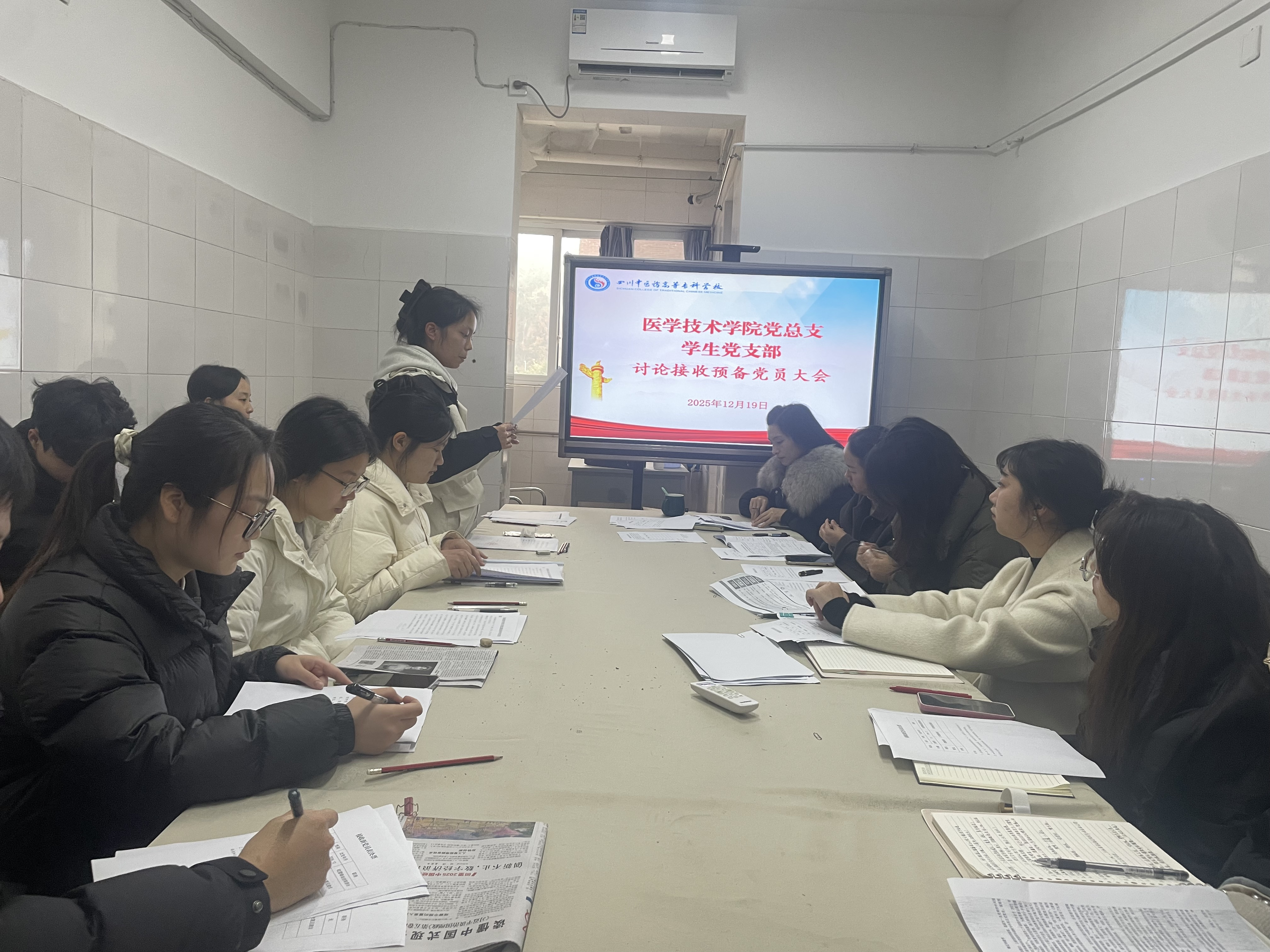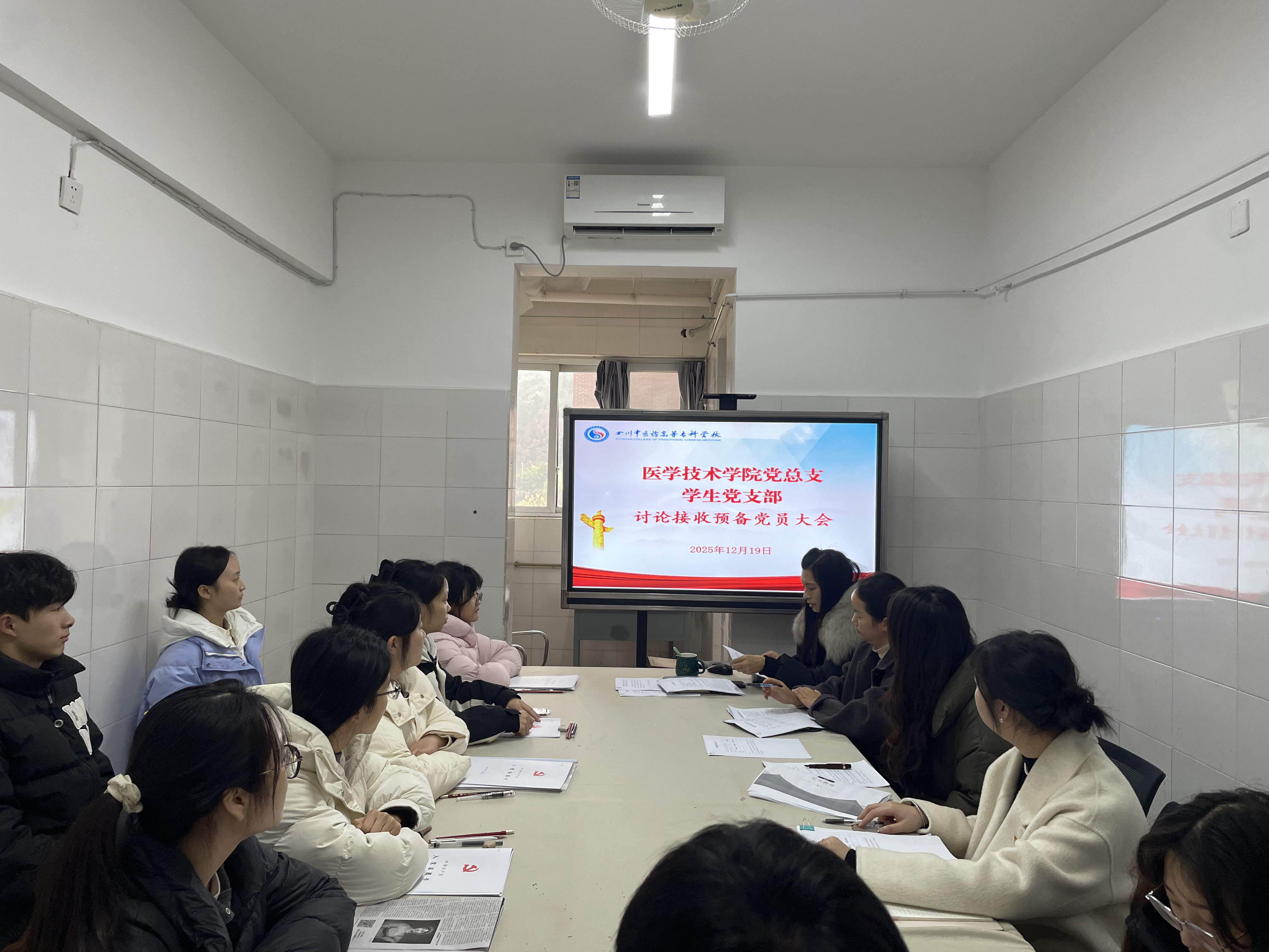 2025年12月19日14:30,医学技术学院党总支学生党支部在南园7-5-1召开党员大会,讨论接收预备党员及吸收正式党员相关事宜;开展支部书记讲党课。会议由学生党支部书记豆蕊主持,全体党员、发展对象参会,入党介绍人列席。