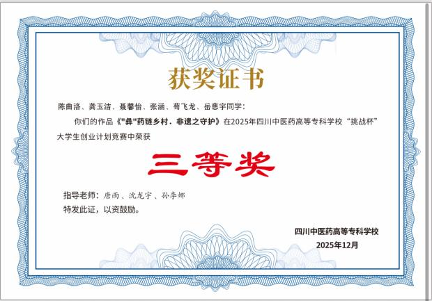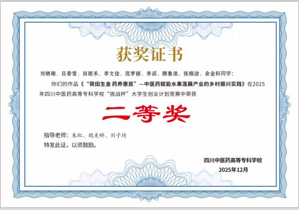 其中,由刘栖瑞同学带领的《“荷田生金,药养惠民”——中医药赋能水果莲藕产业的乡村振兴实践》项目荣获二等奖;由陈曲洛同学负责的《“彝”药链乡村·非遗之守护》项目获得三等奖。两项成果均紧密结合中医药特色与乡村发展需求,体现了学生们扎根专业、服务社会的创新与实践能力。