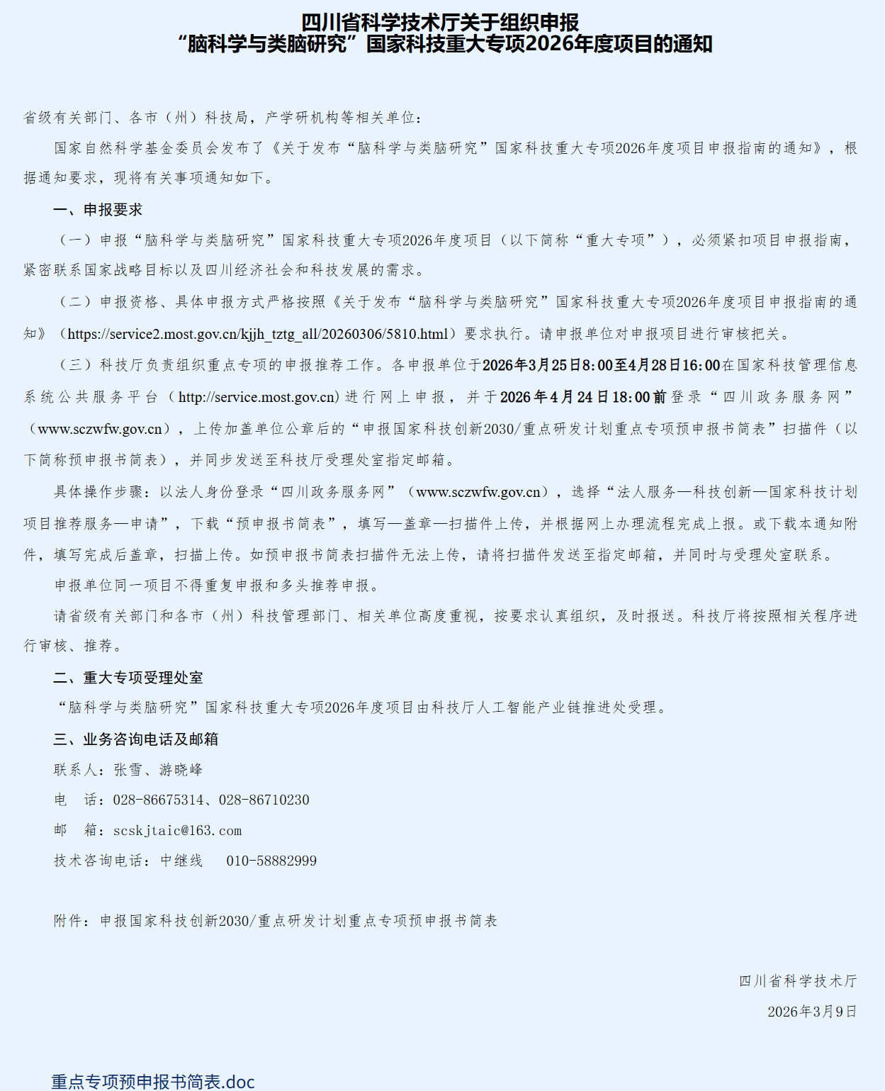 【转发】四川省科学技术厅关于组织申报“脑科学与类脑研究”国家科技重大专项2026年度项目的通知