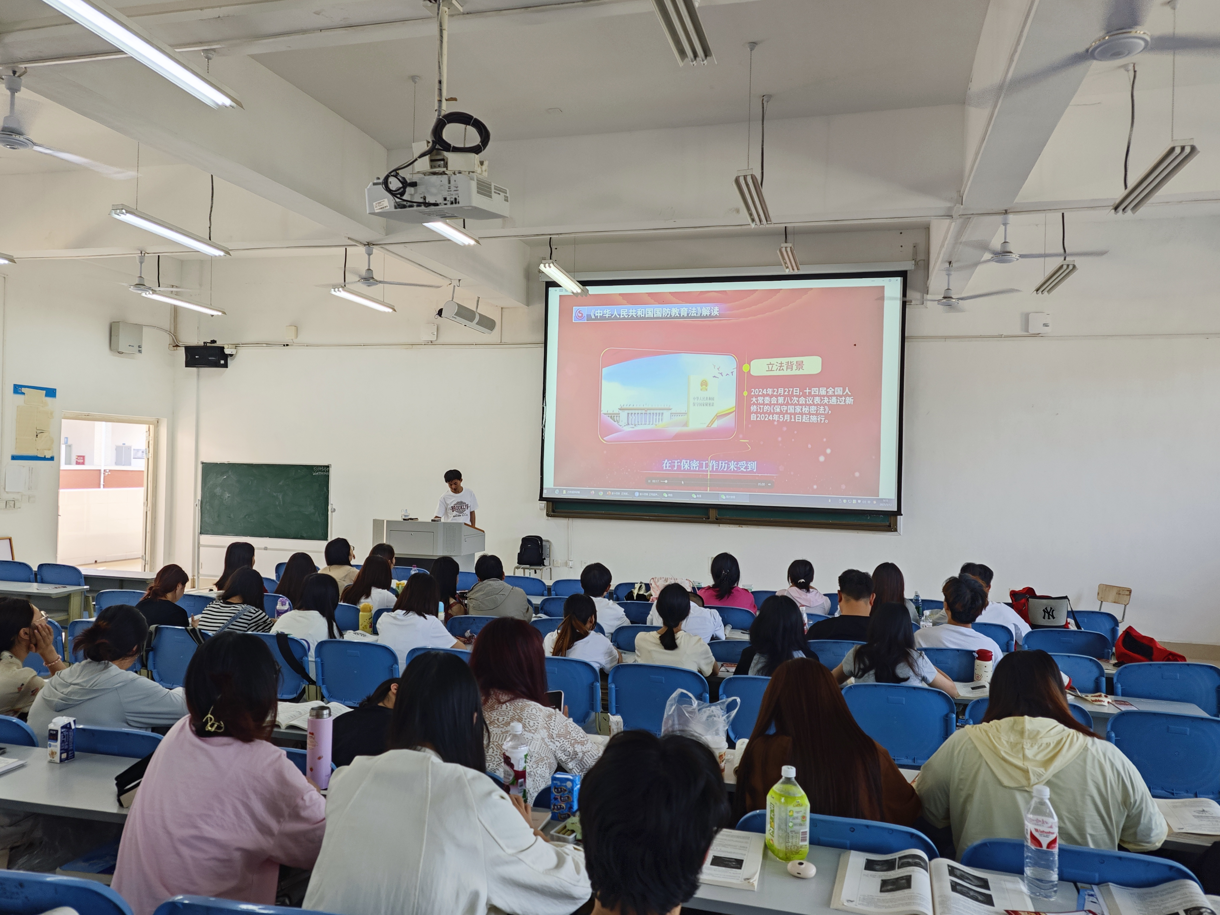为增强学生保密意识,医学技术学院于5月12日至14日面向大一、大二401名在校学生,分批开展“共筑保密防线,公民人人有责”主题班会活动。活动围绕《中华人民共和国保守国家秘密法(2024年修订)》,通过案例解析、互动问答和网络行为情景模拟等形式,重点讲解公民保密义务、法律责任及日常保密风险应对策略。