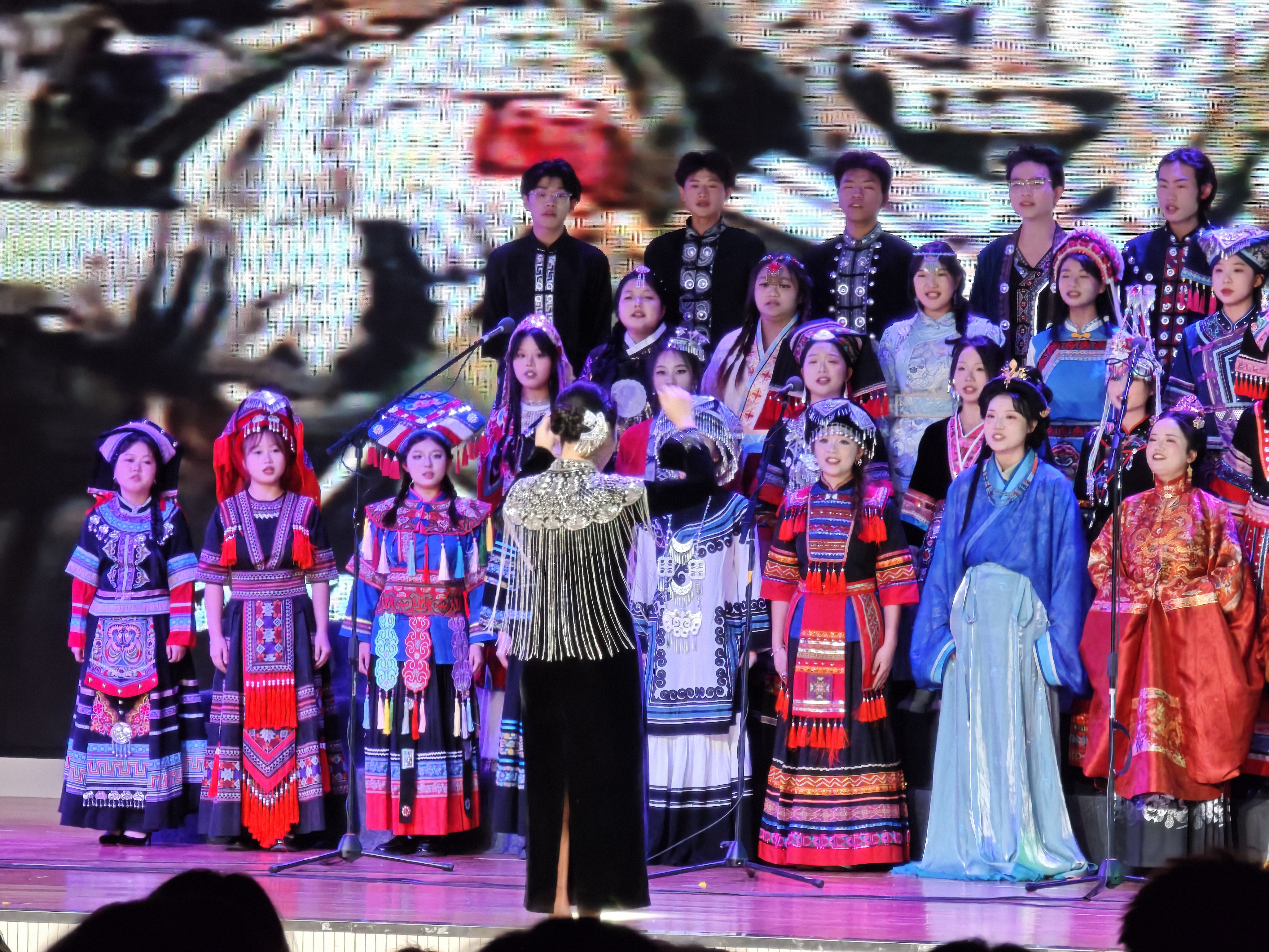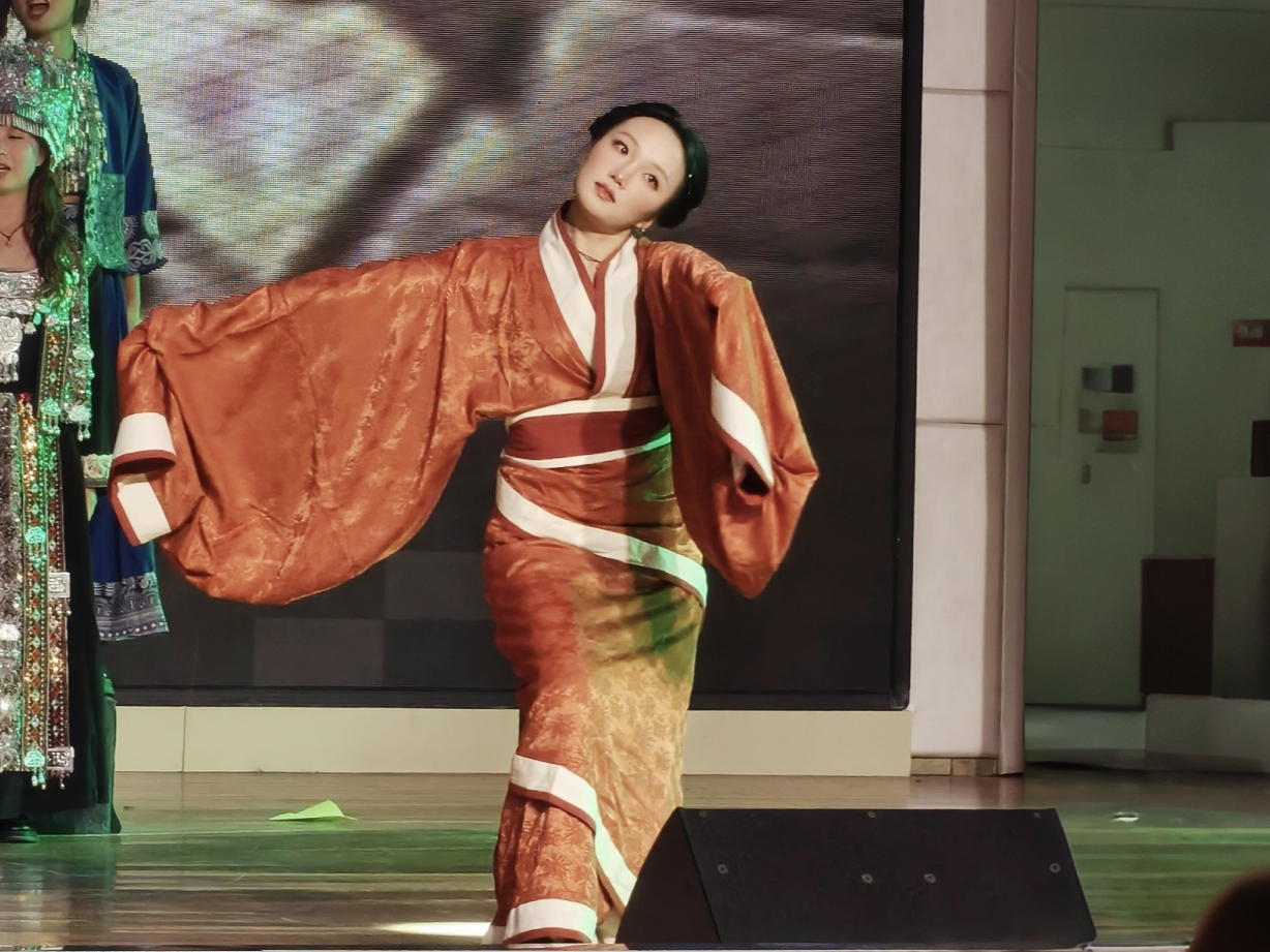 服饰文化:学生身着各民族特色服饰,佩戴精美饰品,展现多民族融合的生机;老师身着各朝代汉服,传递历史厚重感,舞台呈现“传统与现代共生、民族与文化共融”的独特氛围;