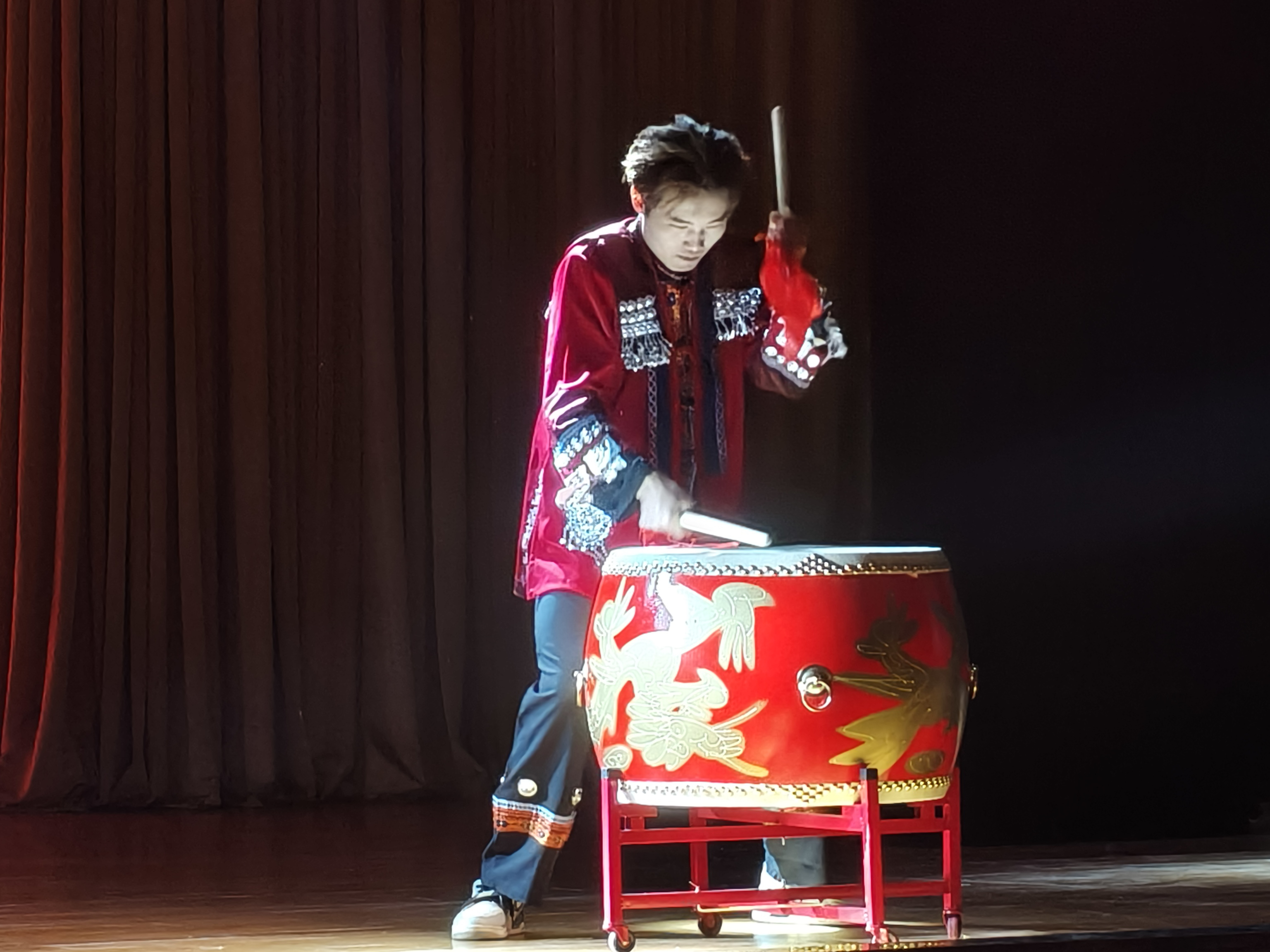 开场震撼:鼓手刘豪在指挥刘子琦老师示意下,以激昂的中国鼓击打开启表演,瞬间凝聚全场目光;